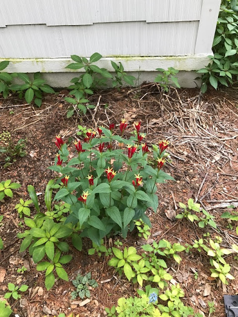 Spigelia marilandica is a native of the southeastern states which makes a superb garden plant. The unique red and yellow flowers appear mainly in late June. The plants appear long lived and can be grown from cuttings. Seed is set but they are ejected from the pods when ripe so it is hard to collect them. They are also not particularly easy to germinate and so far I have not found any self sown plants. This plant is a selection from Plant Delights called "Little Redhead". It is a bit more compact than the typical form. Around it rise Impatiens omeiana and what may be Impatiens qingchengshanica, a pink flowered species of uncertain identity with a long back spur. A pyrola I collected somewhere seems to have established and even is blooming at the edge of the photograph. They are considered difficult to cultivate but I took care to make sure there was plenty of woodland duff with it and also added peat moss and coarse sand to the spot I put it in. Impatiens bicolor seedlings are coming up against the house and have already been thinned once by this time to keep them from overwhelming what is in front of them.