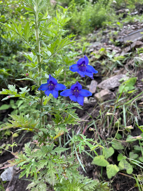 A nice bright Delphinium species growing in a disturbed area with the all too common Mugwort (Artemesia vulgaris) right next to it. The latter is used in Chinese medicine and sometimes eaten but that is not entirely safe as it does contain a toxic compound or two.